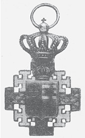 Орденский знак представлял собой крест с концами очень сложной формы – как христианская церковь в плане. Он был выполнен в виде румынского совмещенного со страстным (клеверным) крестом голубой эмали. Между концами креста полыхали языки пламени, чуть прикрытые геральдическими лилиями.