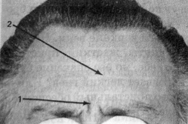 Брови опущены и сведены. На рис. 31 показаны разгневанные брови слева и испуганные брови справа. И у разгневанных и у испуганных бровей внутренние уголки сдвинуты навстречу друг другу. Но когда человек испытывает гнев, его брови опускаются, а когда он испытывает страх, брови поднимаются. В случае гнева линия бровей может приобретать излом углом вверх или просто опускаться вниз безо всякого излома. Сведение внутренних уголков бровей обычно приводит к появлению вертикальных морщин между бровями (1). При гневе не возникает никаких горизонтальных морщин на лбу, а если там все же становятся заметны какие–то бороздки, то они образованы постоянными морщинами (2).