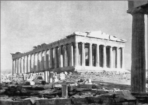 Белоснежный силуэт Парфенона царит над Акрополем. Это классический образец древнегреческого храма, но в то же время он обладает целым рядом уникальных особенностей. Парфенон построен в виде периптера – его центральное помещение со всех сторон окружено колоннадой. Согласно нормам греческой архитектуры, число колонн на продольной стороне храма на одну больше удвоенного числа колонн на торцевой стороне – то есть составляет 8 и 17. Древние архитекторы учли, что прямые линии на расстоянии воспринимаются как слегка вогнутые, и с помощью ряда простых приемов – колонны едва заметно сужаются кверху, угловые колонны несколько наклонены к центру и т. д. – добились того, что Парфенон выглядит идеально четким, гармоничным сооружением.