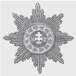 Серебряная звезда ордена Святого Стефана – восьмиконечная, лучистая. В середину ее помещено такое же изображение, как и на лицевой стороне орденского креста, и тоже окруженное дубовыми листьями. Орденские знаки различных степеней различаются между собой по размеру и наличию (или отсутствию) броши-короны.