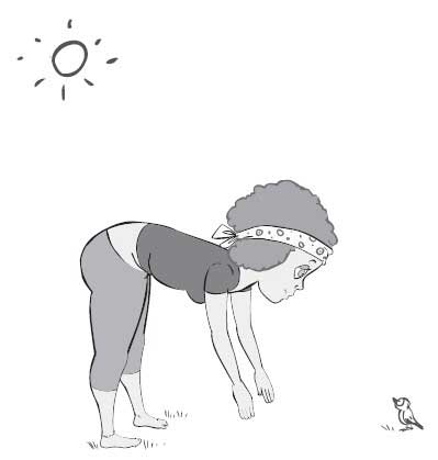 — На выдохе наклоняем корпус вперед и касаемся кистями рук пола.