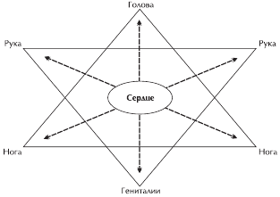 2) сердце – руки. Напряжение в плечах и кистях рук также изолирует сердце: блокируются как гнев (человек не может «ударить с плеча», наброситься с кулаками), так и любовь (тогда пациенту трудно «отдать руки» психотерапевту, он все время их контролирует);